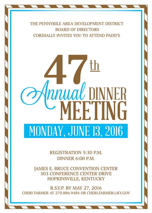 The Pennyrile Area Development District (PADD) will hold its 47th Annual Dinner Meeting on June 13th at the James E. Bruce Convention Center in Hopkinsville, Kentucky. Registration begins at 5:30 p.m. with dinner at 6:00 p.m. CDT.