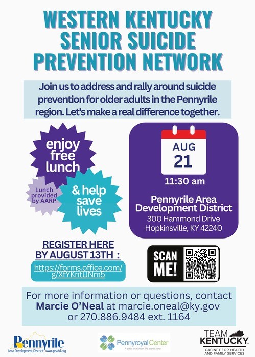 Comprehending the complexities of suicide and mental health is imperative for engaging in suicide prevention, providing support to individuals in crisis, and reshaping the discourse surrounding suicide. Join us to address and rally around suicide prevention for older adults in the Pennyrile region with a Suicide Prevention Taskforce Kickoff to be held on Wednesday, August 21, 2024, at 11:30 am. The kickoff will be held at Pennyrile Area Development District located at 300 Hammond Drive in Hopkinsville, KY.
