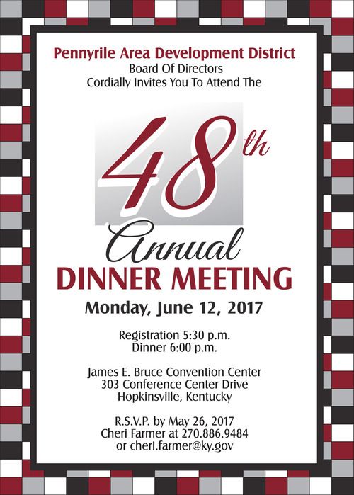 The Pennyrile Area Development District (PADD) will hold its 48th Annual Dinner Meeting on June 12th at the James E. Bruce Convention Center in Hopkinsville, Kentucky. Registration begins at 5:30 p.m. with dinner at 6:00 p.m. CDT.