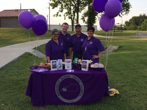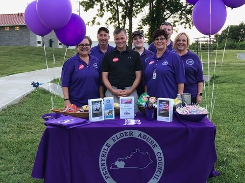 Mayor Carter Hendricks and the Tri Counties Elder Abuse Council celebrated World Elder Abuse Awareness Day at the Pardue Lane Dog Park on Friday, June 15, 2018. Mayor Hendricks released 9 purple balloons representing the 9 counties in the Pennyrile District. The event was held in partnership with Hopkinsville Parks & Recreation “Movies in the Park”. The council provided snacks and information about Elder Abuse Awareness and how to report it.