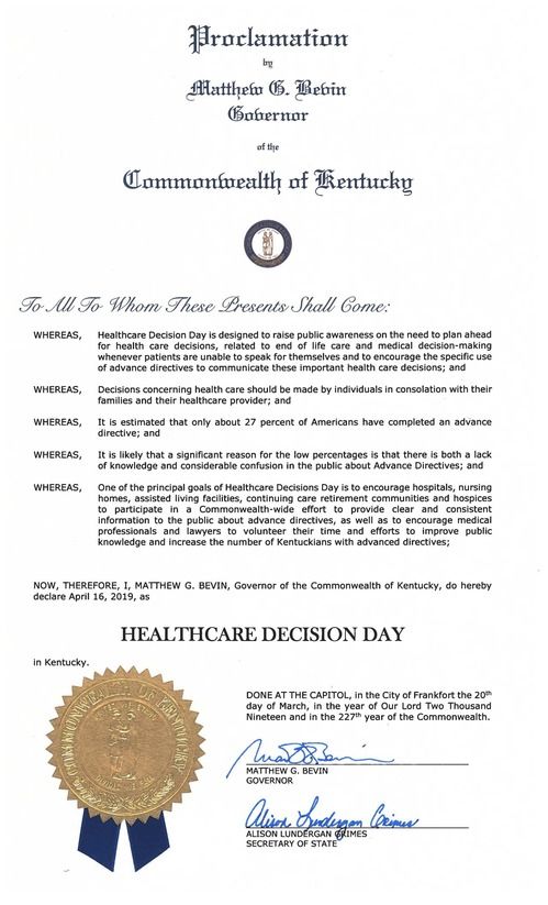 On March 20, Governor Matt Bevin declared April 16th as Healthcare Decision Day in the state of Kentucky. One of the principal goals of Healthcare Decisions Day is to encourage hospitals, nursing homes, assisted living facilities, continuing care retirement communities and hospices to participate in a Commonwealth-wide effort to provide clear and consistent information to the public about advance directives, as well as to encourage medical professionals and lawyers to volunteer their time and efforts to improve public knowledge and increase the number of Kentuckians with advanced directives.