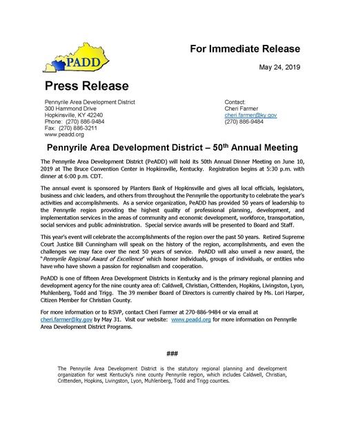 The Pennyrile Area Development District (PeADD) will hold its 50th Annual Dinner Meeting on June 10, 2019 at The Bruce Convention Center in Hopkinsville, Kentucky. Registration begins at 5:30 p.m. with dinner at 6:00 p.m. CDT.