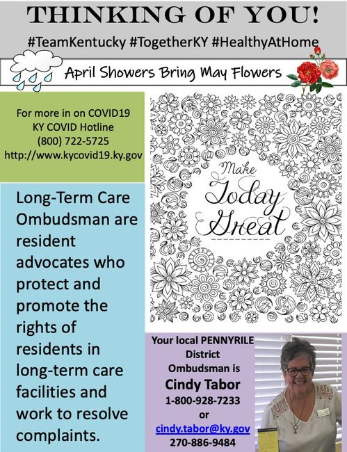 Long-Term Care Ombudsman are resident advocates who protect and promote the rights of residents in long-term care facilities and work to resolve complaints. Your local Pennyrile District Ombudsman is Cindy Tabor 1-800-928-7233 or [email protected] 270-886-9484. For more in on COVID19 KY COVID Hotline (800) 722-5725 http://www.kycovid19.ky.gov.