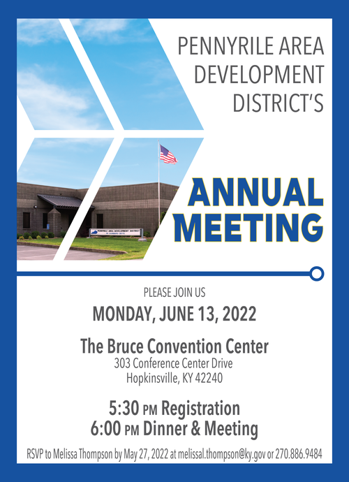 The Pennyrile Area Development District (PeADD) is excited to announce its 53rd Annual Dinner Meeting on Monday, June 13, 2022 at The Bruce in Hopkinsville, Kentucky. Registration begins at 5:30 p.m. with dinner and the meeting at 6:00 p.m. CT.