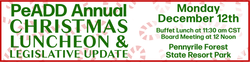 The next regularly scheduled meeting of the Pennyrile Area Development District (PeADD) Board of Directors will occur on Monday, December 12, 2022, at 12:00 Noon (CT) and will be held in person at Pennyrile Forest State Resort Park located at 20781 Pennyrile Lodge Road, Dawson Springs, KY 42240.