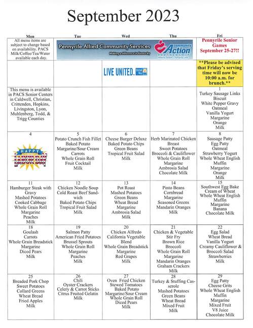 September 2023 Congregate, Curbside and Home Delivered Meals Menu
