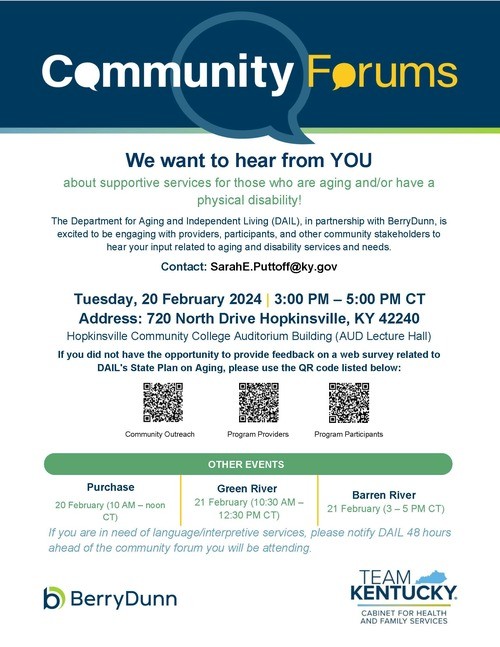 BerryDunn has scheduled community forums to gather information from key stakeholders. The purpose of these community forums are to identify and prioritize the service needs for the Commonwealth of Kentucky, including an evaluation of the current programs provided by DAIL. The community forums are scheduled for two hours and will give you the opportunity to share your opinions regarding current programs provided by DAIL and recommendations for future improvements. Your participation is critical to help ensure the success of this project.