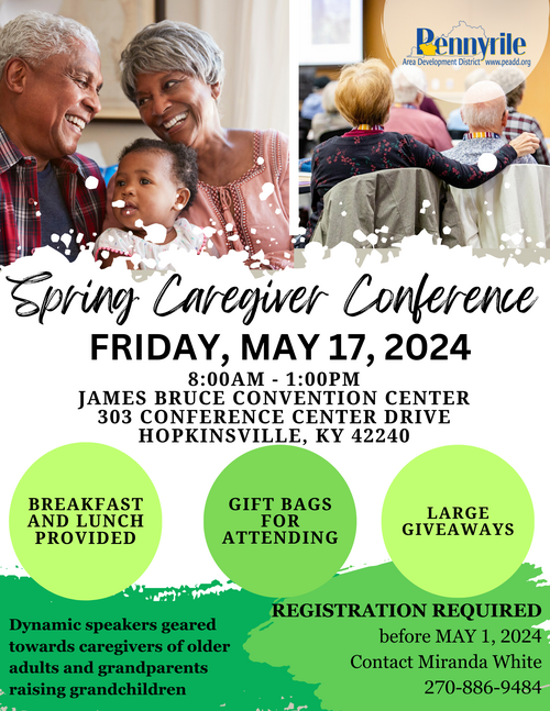 Pennyrile Area Development District is hosting a Spring Caregiver Conference on Friday, May 17, 2024 at the James Bruce Convention Center in Hopkinsville. This event is open to all caregivers of older adults and grandparents raising grandchildren. There is no cost to attend and breakfast and lunch are provided. Registration is required for this event. Please contact Miranda White, Family Caregiver Coordinator, at 270-886-9484 or by email at [email protected] to reserve your spot.