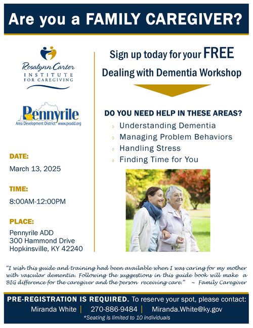 The Pennyrile Area Development District is hosting a FREE Dealing with Dementia workshop on Thursday, March 13 from 8:00am-12:00pm. This workshop will help you navigate the unique challenges of caring for someone with dementia by helping you understand dementia, manage problem behaviors and handle stress. Registration is required. Please contact Miranda White, Family Caregiver Coordinator, at 270-886-9484 to reserve your spot.