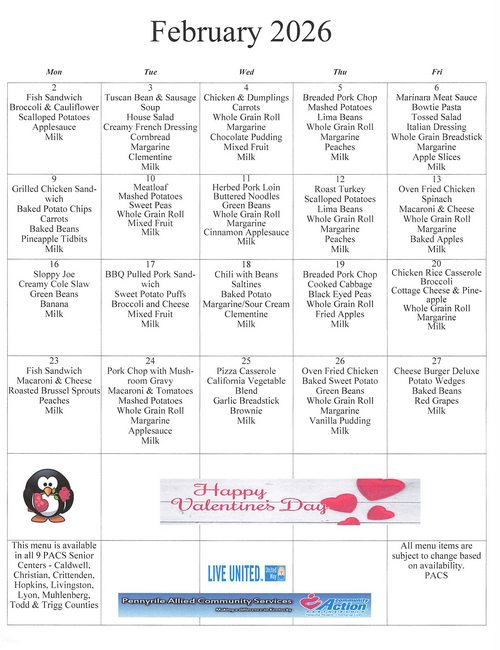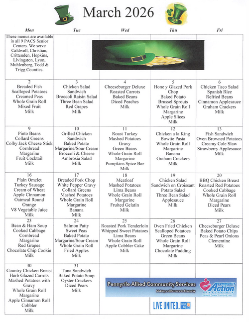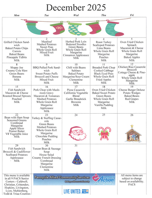 If you are 60 or over and need a meal contact the Pennyrile Aging and Disability Resource Center at 866-844-4396.
